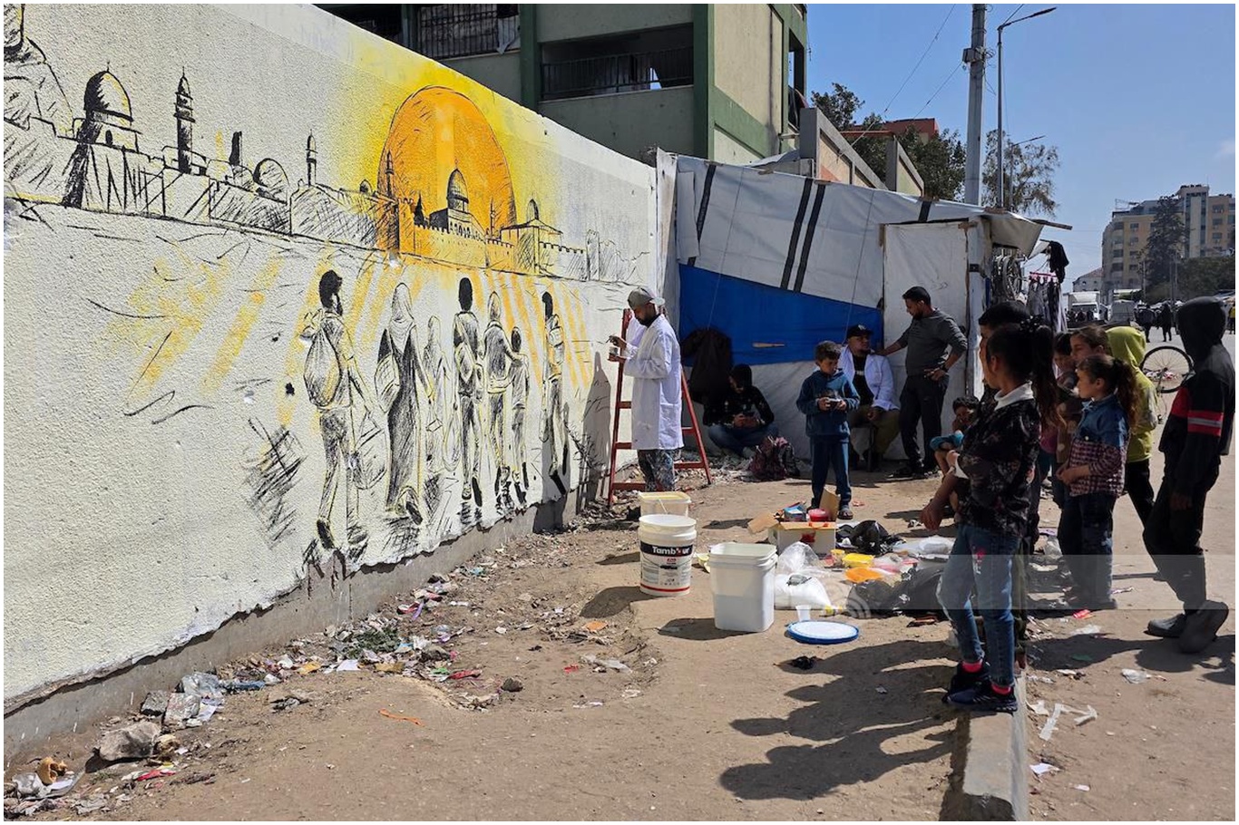 Çatışmalar nedeniyle evlerini terk etmek zorunda kalan çok sayıda kişi, Gazze Şehri’nde barınak olarak kullanılan okullarda yaşamını sürdürüyor. Sanatçılar ise bu alanlarda yaptıkları duvar resimleri ve hat yazılarıyla mekânları daha yaşanabilir hale getirmeye çalışıyor.