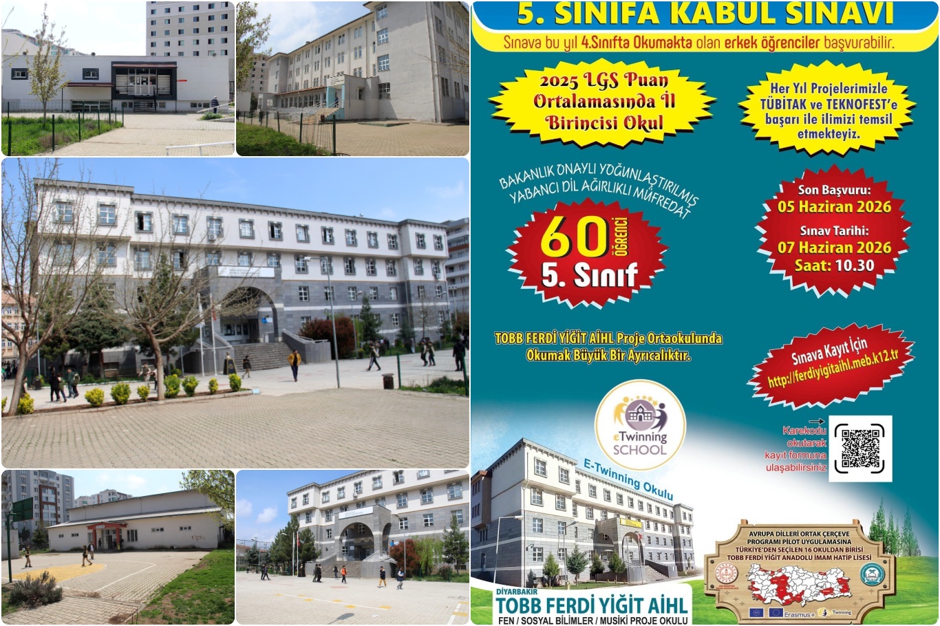 Diyarbakır TOBB Ferdi Yiğit Anadolu İmam Hatip Ortaokulu, 60 öğrenci kontenjanıyla 5'inci sınıf kabul sınavı için başvuruları sürüyor. Okulda, akademik başarı ile birlikte yabancı dil ve rehberlik destekli eğitim modeli uygulanıyor....