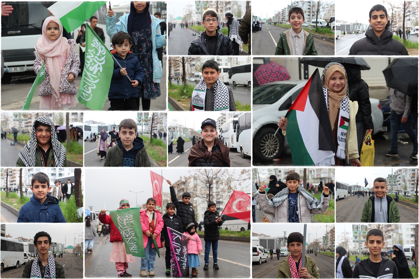 Bağlar ilçesindeki Nevruz Park Alanı'nda gerçekleşen etkinlikte, sağanak yağışa rağmen alanı dolduran çocuklar, Peygamber sevgisini dile getirirken, "Peygamber sevgisi zorlukları göze almaktır" sözleriyle etkinliğin ruhunu yansıttı.