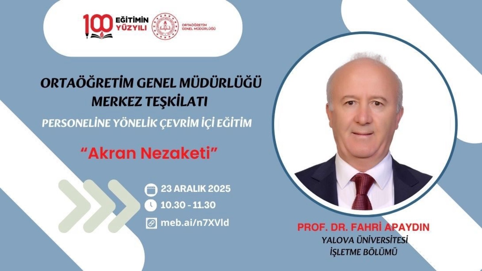 Milli Eğitim Bakanlığından 23 Aralık 2025 Salı günü 10.30-11.30 saatleri arasında, Ortaöğretim Genel Müdürlüğüne bağlı liselerde görev yapan yönetici, öğretmenler ve personele yönelik,